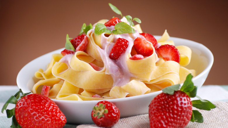If you're from the U.S., you probably think of pasta solely in flavorful terms, but in Poland, pasta doesn't have to be served in a savory, salty format. In fact, fruit can be incorporated into pasta dishes for a sweet, carb-fueled treat. Enter Poland's makaron z truskawkami, which basically translates to "pasta with strawberries." To make this fruity concoction, you'll smash up some strawberries and combine them with sour cream and sugar to make a fruity pasta sauce. Add that to your noodles, and you'll have a unique dish that every pasta lover should try.