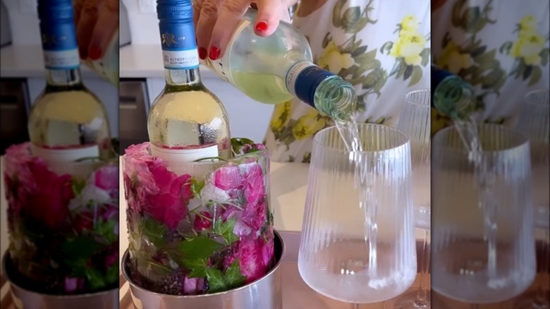 Once you have the mold in your possession, the fun begins. While you can fill the mold with water and have a respectably simple block of ice to keep your wine bottles cool, you can also get creative with ingredients. Insert flower petals or citrus peels into the water before freezing it, or pack your water-filled mold with leaves, berries, and sprigs of rosemary. You can even make frozen layers in intervals should you want to create a more colorful display of horizontal rings.