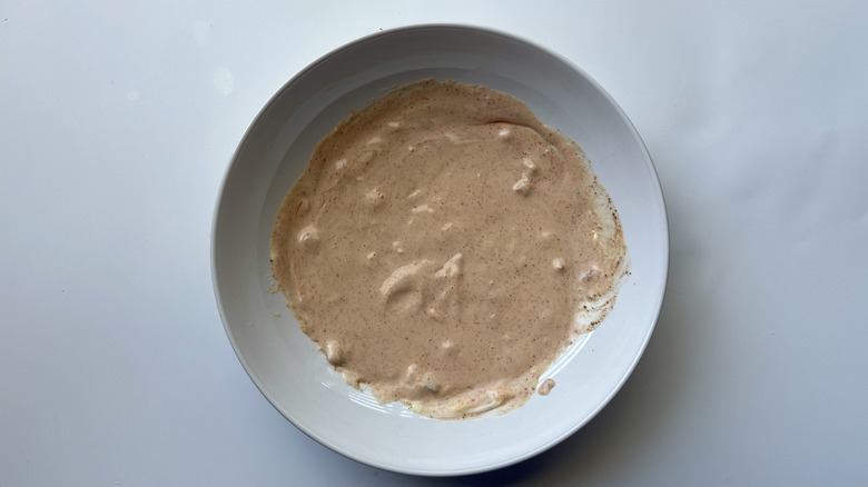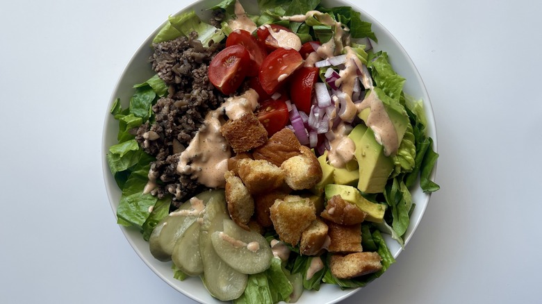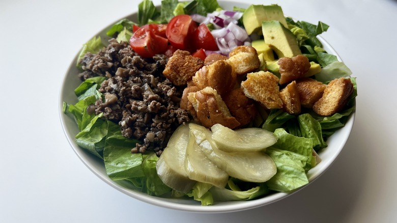 While there are quite a few delicious components to this mushroom burger bowl, Le Moing can't help but highlight a particular one — the hamburger bun croutons. "They're so light and airy compared to other croutons that are more dense and hard," she says, so even if the bun isn't your favorite aspect of a typical burger, it just might be in a burger bowl. Aside from the mushroom beef mixture, lettuce, burger toppings, and bun croutons, there's also a zippy special sauce to top it all off, because no burger (or bowl) would be complete without that special something to tie the whole thing together.