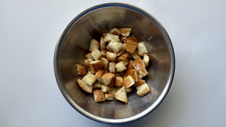 - 4 hamburger buns, cut into 1-inch pieces