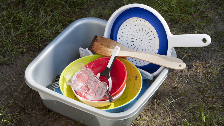Some campgrounds have designated camp sinks, but most do not have this luxury. For this reason, it's important to pack one — but in my opinion, the camp sinks built into tables are a bit overkill. Really, all you need is a bin. Repurpose a plastic storage box laying around in your garage or buy a collapsible camp sink for packing ease.