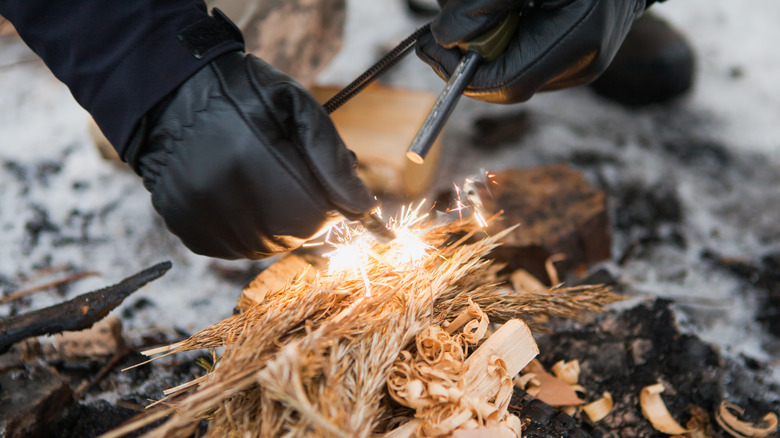 While a simple pocket lighter can generally get a bonfire going, you never know when the weather might turn. Stormproof matches are reliable, even in windy conditions, heavy rain, and snow. But Cody Rydin suggests packing a reusable fire striker which involves two pieces: a rod made from ferrocerium and a stainless steel plate. To start a fire, you point the ferro rod a few inches away from your tinder, then apply pressure as you quickly scrape the steel plate down the rod. This action results in a spray of sparks which will quickly ignite various types of fire starters. Flint and steel can create the same effect, but are less user-friendly — and to Bobby Massie's point, cooking outdoors should be a primitive, yet comfortable experience.