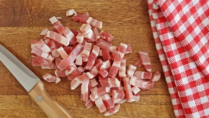 This trick works for turning sliced bacon into lardons, as well as cutting a piece of cured pork belly into cubes or slices, just like you would slice a ribeye for a cheesesteak. Use a sharp knife to perfectly portion your pork. And while you're at it, consider freezing your bacon in individual servings for quick defrosting and easy portioning.