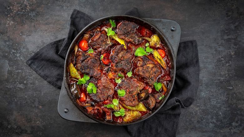 "I really enjoy cooking this protein over the fire and [then] braising it properly in the oven," Ratino said. For anyone unfamiliar, braising refers to the cooking method of briefly searing meat over high heat, then slow cooking it in a thin layer of liquid, often alongside vegetables. The liquid used may be stock, water, or even wine or beer. The result is juicy meat and tender vegetables — and an all-around delicious meal.