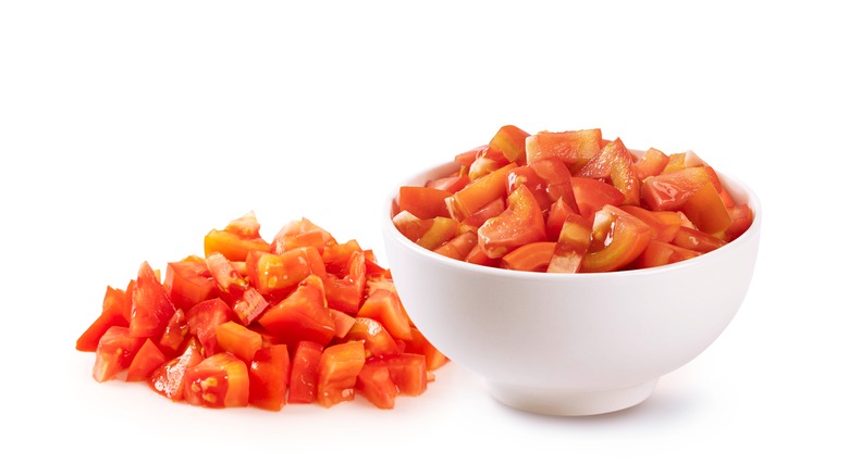 Finding bits of tomato peel in your food isn't everyone's cup of tea, especially with bruschetta. In fact, tomato skin — which is thin and almost imperceptible on an unsliced tomato — starts to become a real nuisance atop bruschetta. When large tomatoes (such as heirloom or vine) are cubed for the dish, the skin starts to take on a mind of its own. It might adhere to the tomato pulp, or go rogue and float around the mixture before getting caught in your teeth. The best thing to do before starting bruschetta, then, is to blanch the tomatoes.