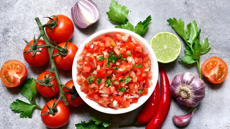In this case, you might want to add a few more ingredients to make it interesting. For instance, this bruschetta caprese recipe makes it clear that the bread — while a great accompaniment to the tomato mixture — isn't entirely necessary. That makes it a great option for people who adhere to a gluten-free or low-carb diet. As the name suggests, you can also add diced mozzarella to your tomatoes along with olives, oregano, and the rest of the usual bruschetta gang. The result is bulky enough to constitute its own salad meal.