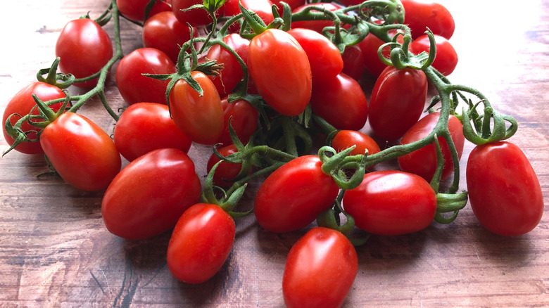 Actually, when it comes to bruschetta, smaller tomato varieties might be the best way to go. For instance, cherry tomatoes, which tend to be sweeter, make an excellent choice. Their subtle combination of sweet and acidic can provide a major flavor boost to this simple dish. Another great option is datterini tomatoes, which are another variety of plum tomatoes. The name means "little dates," and refers to the tomato's shape and sweet flavor. Datterinis behave in much the same way as cherry tomatoes and are just as sweet (if not more).
