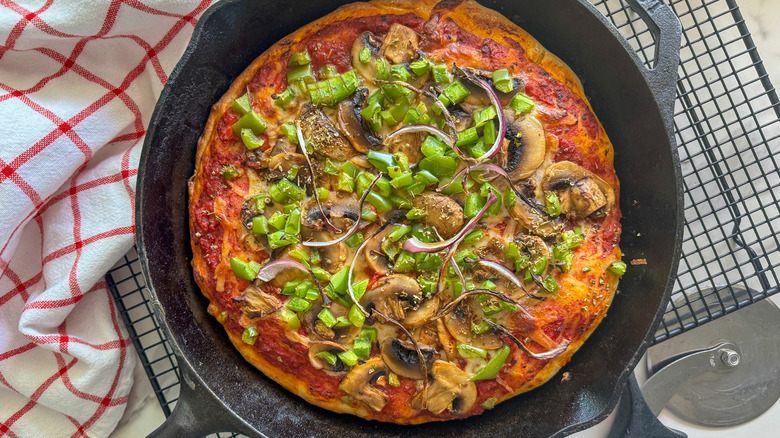 This method of pizza making is broken down in Tasting Table's recipe for veggie lovers cast iron pizza, which was developed by Miriam Hahn. The dough is added to the cast iron skillet right after it's made — after it rests, you spread the dough and add the sauce and toppings. Next, the key step: The skillet is placed on the stovetop on high heat for three minutes. This step gets the bottom of the crust nice and crispy. From there, the cast iron is transferred to the oven, where the crust and toppings finish baking (about 15 to 20 minutes at 450 degrees Fahrenheit). When the pizza comes out of the oven and you slice it, you'll be delighted to find that the crust is crisped up to perfection.