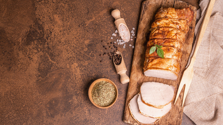 Before air frying pork tenderloin, it's also important to remove the silver skin — otherwise, the outside will end up chewy. As you do this, preheat the air fryer to 400 degrees Fahrenheit. This higher temperature cooks the meat quickly, leaving it with a perfectly browned crust. You can also cut the pork tenderloin in half to speed up the process which should be done within 20 minutes.