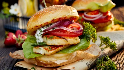 Halloumi cheese makes an excellent meat-free burger replacement for a number of reasons — its texture in particular. Halloumi cheese is made with sheep or goat's milk and brined, with a firm texture that has a tendency to squeak when chewing. Squeaky wheel of cheese aside, one of the most interesting features of halloumi cheese is the fact that it can stand up to the high heat of grilling while keeping its shape. This, in addition to its briny flavor, makes it the ideal cheese patty to substitute in place of a traditional hamburger, with a wide variety of options for preparation and dressing.