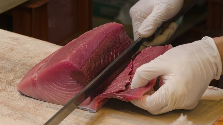 Similar to breaking down poultry, butchering a fish is an acquired skill. Zimmern gives us a brief overview of the technique: "Run a knife down the middle of the fillet, piercing the skin parallel to the center bone, and then removing all four panels on the sides." But in order to truly understand how to butcher tuna, Zimmern suggests watching an Outdoor Channel video filmed for his "Wild Game Kitchen" show, featuring the chef showing how to properly break down tuna.