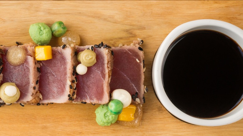 There are a number of ingredient combinations that create a tasty sauce for dunking tuna. Andrew Zimmern explained that his favorite dipping sauce for tuna steak is a mixture of soy sauce and fresh lemon juice in a 2:1 ratio — but he emphasizes that this should be made with "a really good, naturally brewed soy sauce."