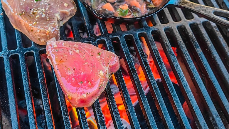You can prepare tuna on any type of grill that produces fire, but you'll achieve enhanced layers of flavor from tuna steak if you grill it over wood. This imparts a light smokiness to tuna's brightness, creating contrasting-yet-compatible savory profiles. Grilling over wood also brings you one step closer to nature. Andrew Zimmern grills food the way our ancestors did — over a large firepit — and while he strongly prefers cooking over wood, he says that you can also use a gas grill for tuna steaks.