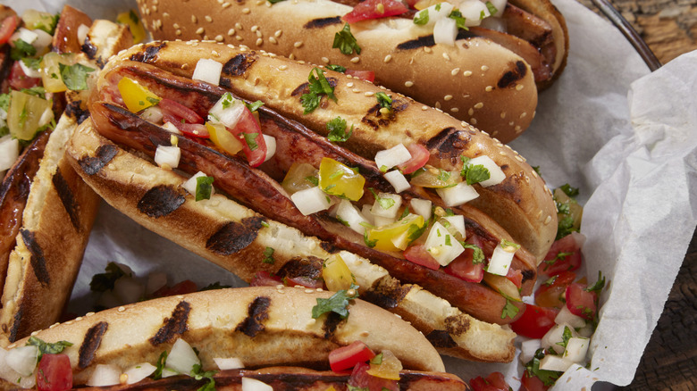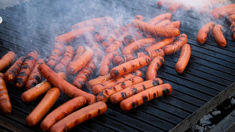 Barring brats and ultra-fancy brands, most hot dogs are cheap, mystery-meat sausages with a synthetic casing that could use a textural upgrade and added depth of flavor. That's where butterflying comes into play. As its name implies, butterflying involves creating a vertical slit down the center of the hot dog, so its flesh opens up like the wings of a butterfly, incurring both the crispy charred texture and smoky flavor from the grill. A butterflied hot dog creates a better all-around flavor experience with a larger flatter surface area to garnish with toppings and condiments. However, exposing the entirety of its flesh might result in a dried-out or burnt hot dog. So, to avoid the risk of overexposure when splitting your hot dogs, you should make smaller, horizontal slits along the dog.