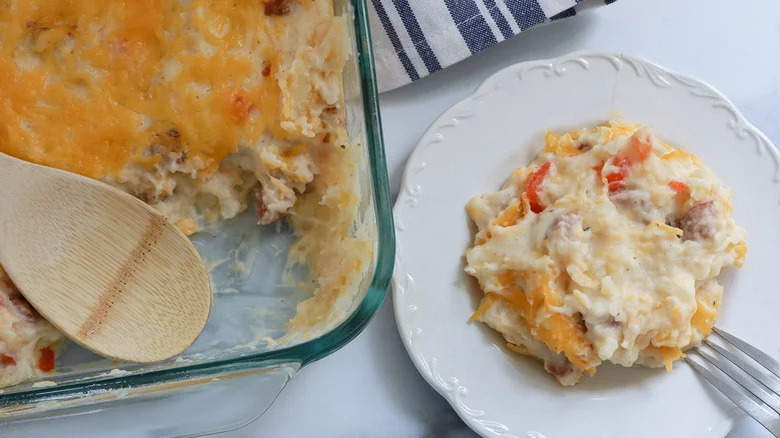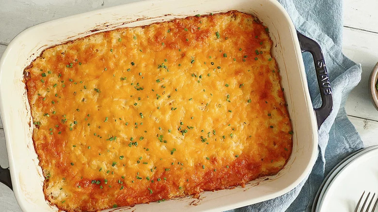 As rich and satisfying as cheesy potato casseroles are, they don't always pack in the biggest flavor punch. So if a little more spice is what you're looking for, you'll want to try this Cajun potato casserole. You'll find all the usual culprits here (like butter, onion, and milk), but you'll also get plenty of Cajun spice and chopped andouille sausage. Plus, this dish breaks up the smoothness and creaminess of mashed spuds with texture in the form of meat and diced bell pepper. But in the end, the whole casserole is coated in a layer of shredded cheddar, so you still end up with that cheesy crust you're looking for.