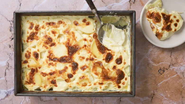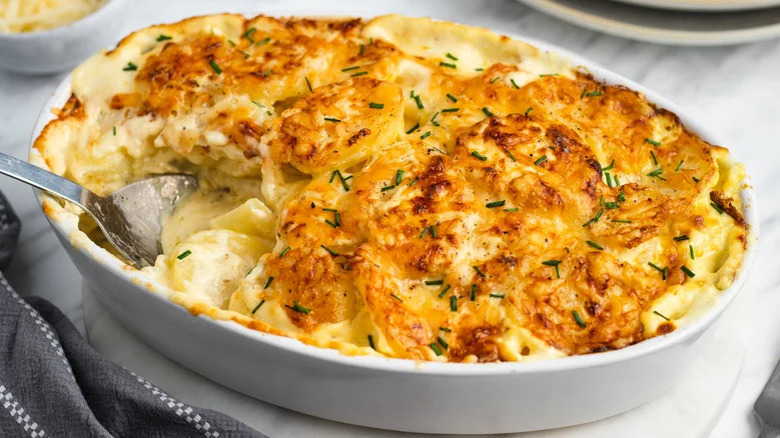 Make no mistake — this is another potatoes au gratin recipe, but this one comes with a twist. You'll saute sliced onions before tossing them into this dish, which adds a lovely sharp and sweet flavor. You'll also add Dijon mustard into the white sauce, which balances out the mildly flavored richness and creaminess. Then, you'll sprinkle diced, thick-cut smoked ham throughout your pan to add a nice smoky depth and a slight chewiness in each bite. Of course, the whole thing will still be finished off with a white sauce and grated Gruyere.