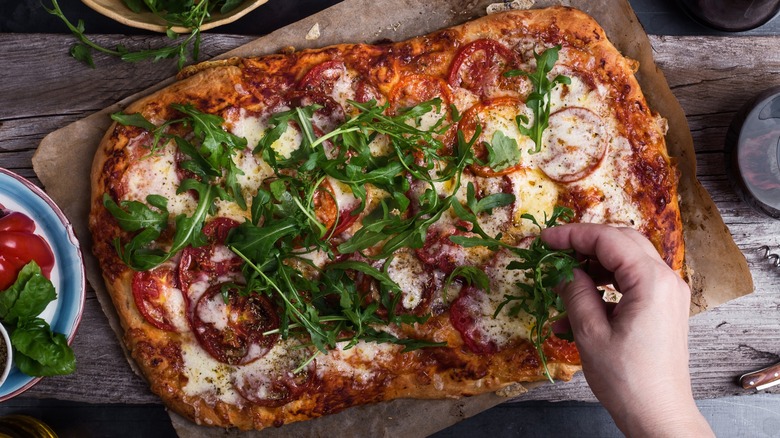 Finally, some toppings should be used as a garnish after it comes out of the oven, just before you serve and eat it. Fresh herbs such as basil and greens like arugula do not need to be cooked with the pizza. A drizzle of hot honey or olive oil, dash of hot sauce, or squirt of ranch should also go on the pizza after it's been cooked. Finally, your go-to finishes, like red chili flakes, grated Parmesan, garlic powder, and even black pepper, can be sprinkled on just before the first bite, just like you would do at your local pizzeria. And to really step up your game, here are more tips for making the best homemade pizza.