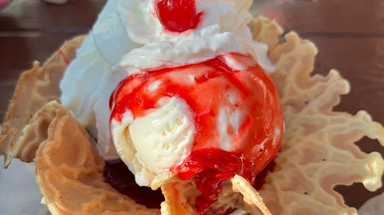 From the Strawberry Passion hot fudge sundae to the Cookie Crumble sundae, which has vanilla and cookies 'n cream ice cream, handmade hot fudge, cookie crumbles, and mini milk chocolate caramels, there's no wrong order at this shop. However, there is an extra right order. Go for the Golden Gate banana split. This dessert has vanilla, strawberry, and chocolate ice cream, topped with crushed pineapple, strawberries and handmade hot fudge. This is all served with a banana, whipped cream, diced almonds, and a cherry.