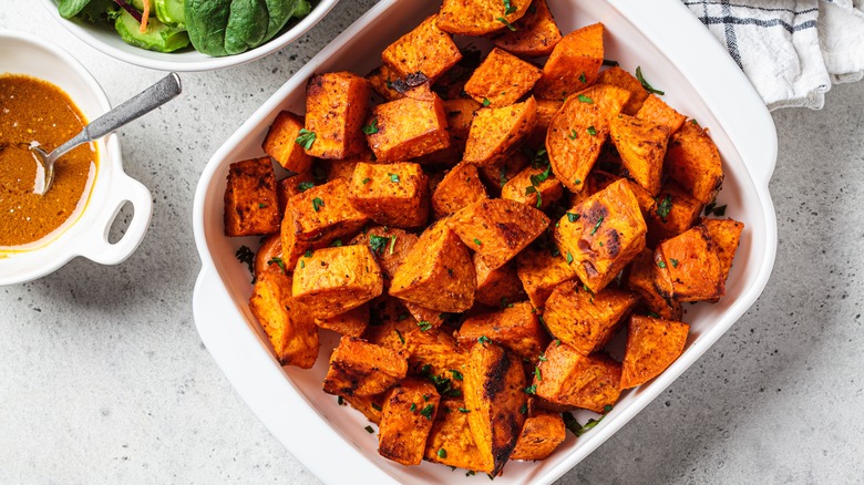Sweet potatoes have their fair share of sugar; it caramelizes in the oven, giving the vegetable more depth. To get that flavor on the outside, as well as a crisp surface, brown sugar butter is key. It's easy to toss cubed sweet potatoes in it, with the butter helping the sugar adhere to the veggie. In the oven, the sugar will be the first thing to caramelize, giving the potatoes an even, delicious crust.