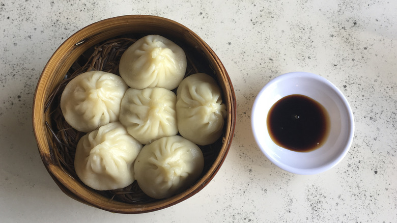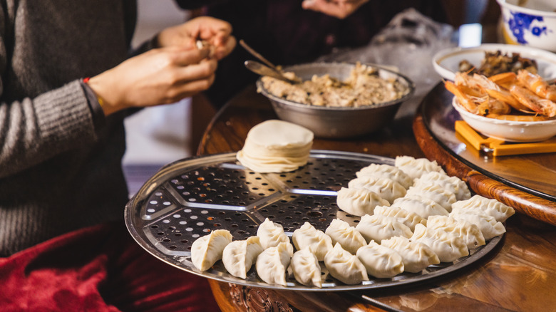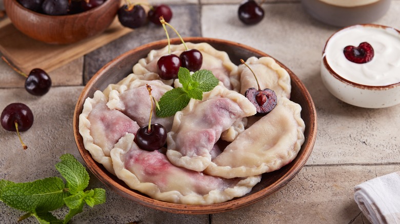Finally, the two dishes are often served differently. Dumplings may be served on a platter, in a bamboo steamer basket, or in soup. And they almost always come with a dipping sauce or a selection of sauces to mix up your own — like black vinegar, soy sauce, and chili crisp. For pierogis, sauce is less of a requirement, although they are frequently served with sour cream and may be topped with a sauerkraut or sauteed cabbage.