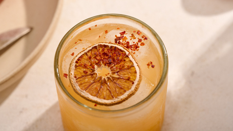 If the hot honey is enough heat for you, go in another garnish direction and add a slice of orange, blood orange, or lime. For a more rustic approach, use dehydrated fruit slices. You can also go herby, adding a sprig of thyme or rosemary to the drink instead. Lastly, for a unique garnish that emphasizes the heat of the honey, slice a small notch into a red chile pepper and balance it on the rim of the glass. Be careful with this garnish, though — any contact with the chile's juices will make the drink unbearably spicy.