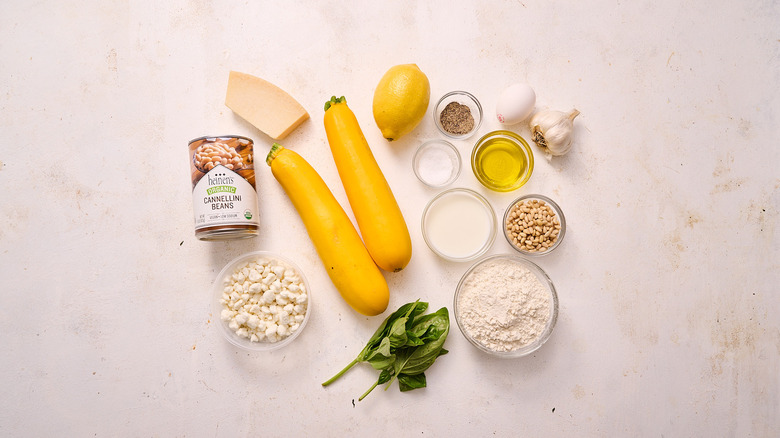 For the fritters, you'll need salt, pepper, flour, olive oil, egg, garlic, squash, and beans. You'll want to choose a soft white bean for this recipe, such as cannellini, great northern, or navy — garbanzo is not as creamy but can work in a pinch. As for the squash, you'll need just one cup, which is only about half of one medium-sized squash. From there, you'll also need crumbled goat cheese, milk, basil, pine nuts, lemon juice, and Parmesan. You can swap the pine nuts for any nut, like walnut or almond, or simply omit them if you have any allergies.