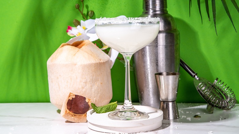 To achieve this flavor match, follow the basic fat-washing instructions. Heat the coconut oil on the stove until it's an easy-pouring liquid. Add it to a container with your tequila, shake it well, and let it sit at room temperature for a few hours until the oil and tequila combine. Then, freeze the mixture until the fat is totally solid so that you can remove it from the alcohol. After you've poured the tequila out, straining it is vital to ensure no solids are left behind — a coffee filter is easy and effective.