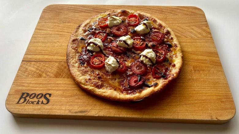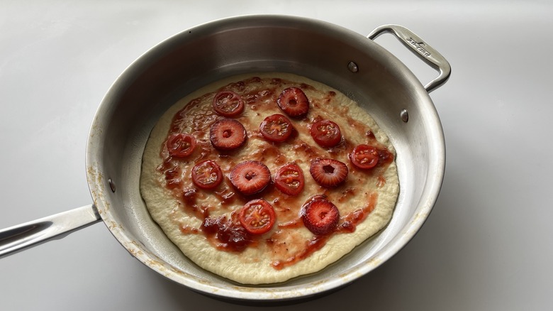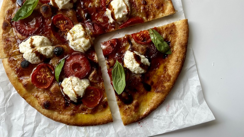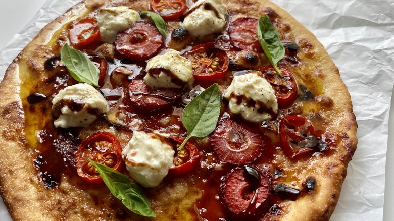 Next, you'll need strawberry jam, ricotta, a large strawberry (sliced into rounds), and cherry tomatoes (sliced into rounds). To season the pizza, use extra-virgin olive oil, balsamic glaze, Maldon flake salt, and freshly ground black pepper. The final summery touch is fresh basil, which goes perfectly with both tomatoes and strawberries. If you don't have any balsamic glaze, Le Moing offers an easy trick to make your own. "Simply pour ¼ cup of balsamic vinegar into a pot and simmer over medium heat until it starts to thicken and coats the back of a spoon." If you're making this for a crowd, simply double up on the ingredients and make two pizzas.