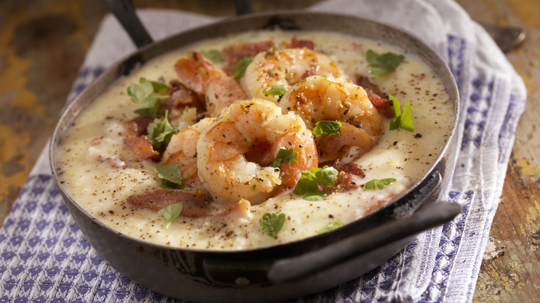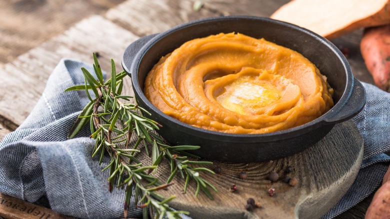 Grits are a uniquely Southern side item, one so good that they even won the favor of the decidedly non-Southern titular lawyer in the film "My Cousin Vinny." Though similar to polenta, grits are traditionally viewed as a breakfast item, cooked with generous amounts of butter, and drizzled with sweet toppings, such as maple syrup or honey, and savory ones, such as gravy and eggs. That said, grits shouldn't just be relegated to the morning meal as they are a staple in dishes like our old-fashioned shrimp and grits – nor should they exclusively be cooked rather plainly. Adding in new and unusual ingredients can give untold dimensions to grits, and one of our favorites is another Southern staple: sweet potatoes.