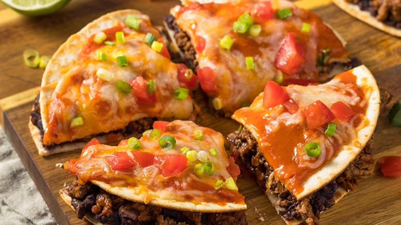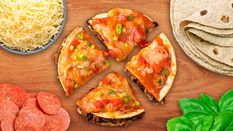Tortillas are the perfect vessel to house toppings like cheese and serve as the crispy crust to a personal-sized pizza. The idea is to top a quesadilla with pizza ingredients. So, you'll start by assembling and cooking a quesadilla as usual. Then, you'll spread pizza sauce, toppings, and more cheese on top before a second round of cooking.