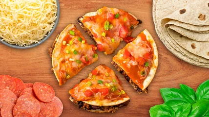 Pizzas and quesadillas are prime examples of simple few-ingredient recipes that have been adapted to the resources and cooking styles of culinary traditions around the world. The cheesy, flat-bread foundations also facilitate the fusion of quesadillas and pizza as the ultimate two-in-one snack.
