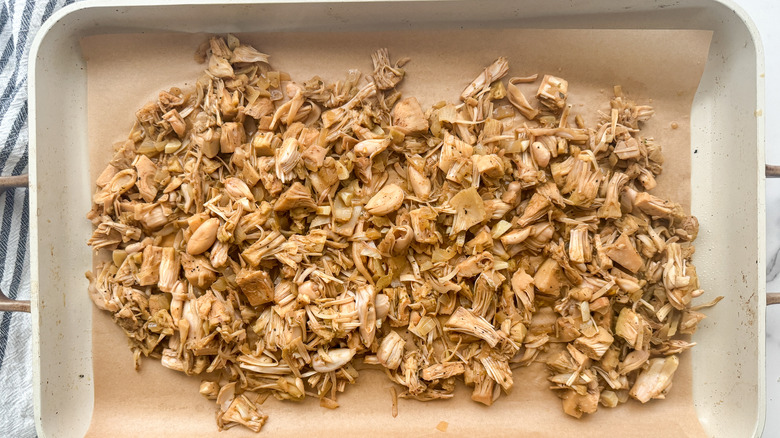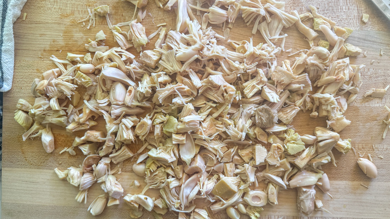 - With your hands, shred the jackfruit and set it aside.