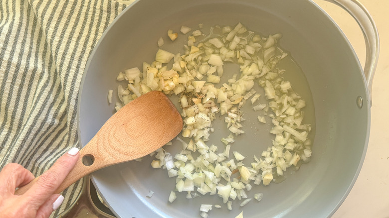 - Add the onion, garlic, ½ teaspoon of salt, and pepper and cook for 5 minutes.
