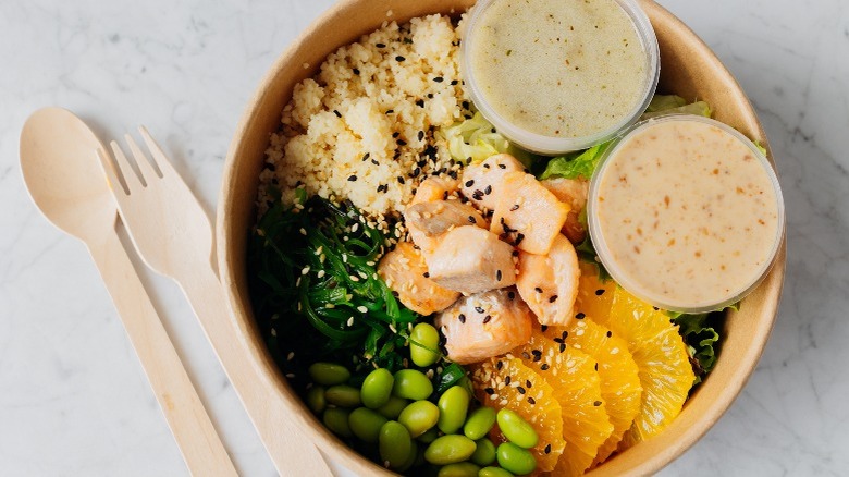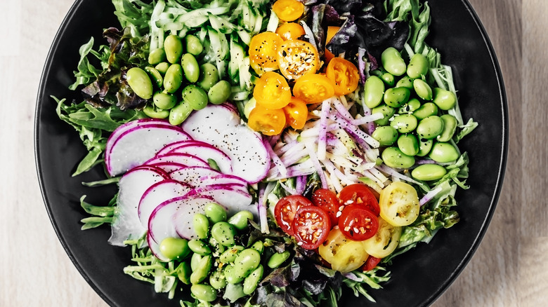 Once your edamame is cooked to perfection, it's time to decide what else to pair it with. There are numerous salad components that go well with the soybean, but a good place to start is with a California roll bowl. You can easily swap out the bed of seasoned rice for lettuce to give this dish more of a "salad" feel, and top it with other fresh favorites like diced cucumber, imitation crab, and your crispy or steamed edamame. The best part about using the legume in this bowl is that it ties into the other vegetables present, and adds a fresh flair to an otherwise heavy dish.