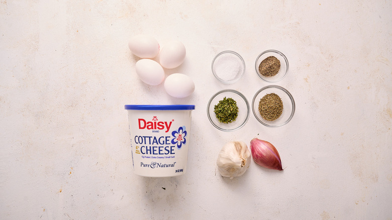 The only ingredients you will need for this recipe are cottage cheese, eggs, a shallot, garlic, dried parsley, dried thyme, salt, and pepper. You can use fresh herbs if desired, or vice versa, swap and use powdered garlic and onion powder instead of fresh. Any cottage cheese will work, but you'll have the most success (and most moist flatbread) with 1 to 2% fat.