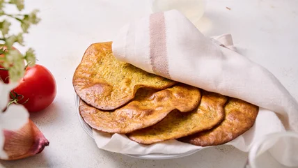 For a flatbread-take on a classic sandwich, fill the flatbread with lettuce, tomato, mayonnaise, and bacon for a flatbread BLT. Add mozzarella and pesto for a caprese twist, or use seitan or tempeh for a vegetarian alternative. You can also swap the bacon for deli meats like turkey or ham. You can also use the flatbreads in place of pita, wrapping them around red onions, tzatziki, and shaved steak for a light gyro. Finally, if you're more of a dip-and-scoop person, use these flatbreads in place of naan for a high-protein accompaniment for chicken tikka masala or traditional curries.