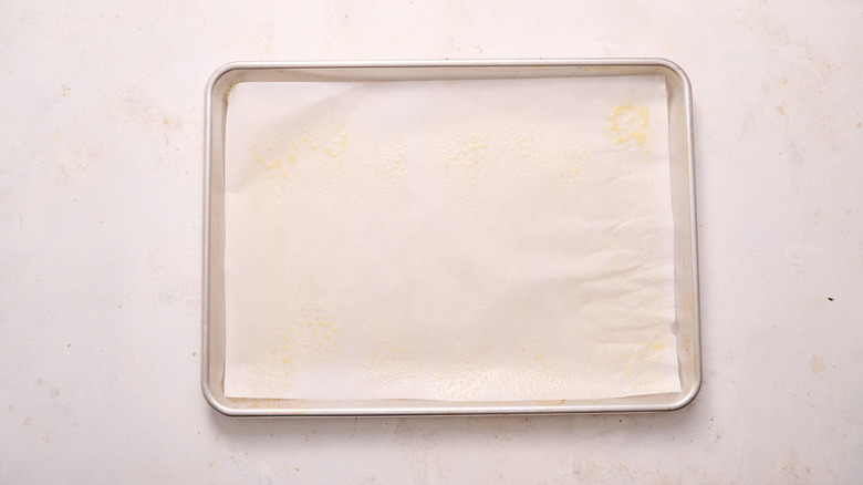 Slowly pour the mixture onto the sheet tray in four ½-cup sections.