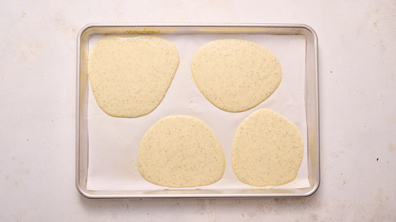 - Slowly pour the mixture onto the sheet tray in four ½-cup sections.