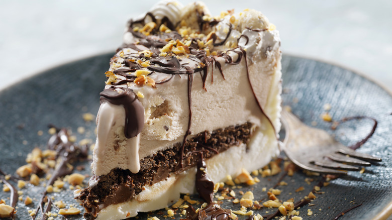 If you've decided not to purchase an ice cream cake from a place like Salt & Straw — which launched its first-ever ice cream cakes in 2023 – then you've got to make a plan. It is important to decide what kind of cake you'll be using and an ice cream that will pair well with it. A classic yellow cake works with a variety of flavors, from strawberry ice cream to chocolate. You can even make an ice cream cake reminiscent of an orange creamsicle. No matter what flavors you go with, you should use the cake as the base of the dessert. The ice cream can be added atop or in multiple layers. Let the ice cream get soft before constructing the ice cream cake so that it is easier to sculpt, but not so soft that it can't hold its shape.