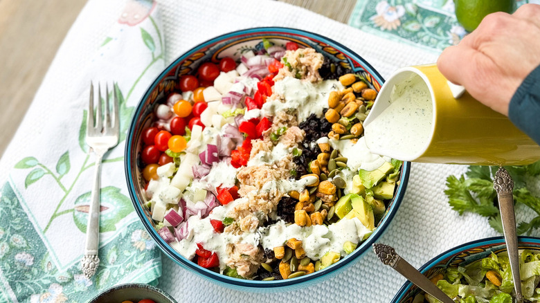 We're talking about the custom dressing featured in our original Mexican-inspired tuna salad created by Tasting Table recipe developer Julie Kinnaird. The dressing works so well in this particular salad because its creaminess melds well with the crunchy lettuce and tortilla chips, while its spice levels provide more heat and flavor to the tuna. It gets heat from jalapeños, acidity from fresh lime juice, and an herby boost from the cilantro. The creamy base comes from a combination of mayonnaise and sour cream, two ingredients that also temper the spicy flavors from those other ingredients.