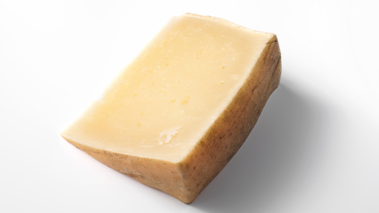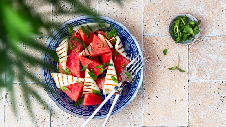 Unlike the other cheeses on our list, halloumi is cooked before being eaten. While it can technically be eaten raw, the texture is not particularly enjoyable — but once it hits a griddle pan for a few minutes, that's a different story. Though it doesn't melt like mozzarella or cheddar, it softens and turns golden brown, providing a satisfyingly chewy texture and mild flavor. Cameron Smith is a fan of the watermelon and halloumi pairing, saying that "the summer watermelon gets a little salt from the halloumi." The contrast of salty, sweet, and juicy makes for a delicious mouthful with various textures at play.
