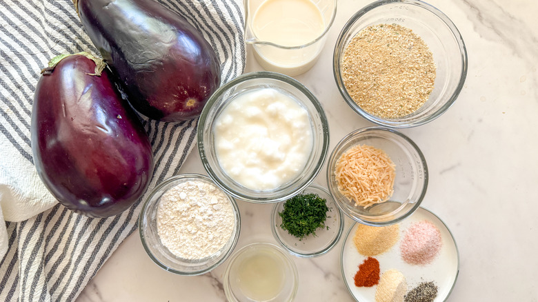 Gather the ingredients for air fryer eggplant fries and dill dip