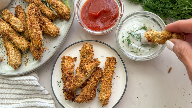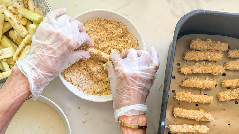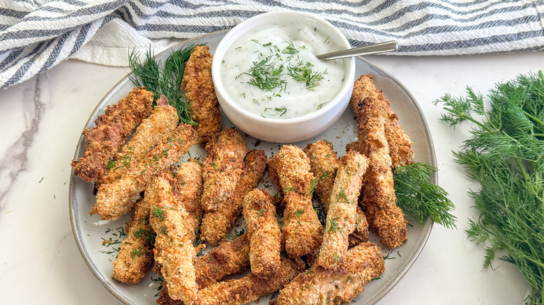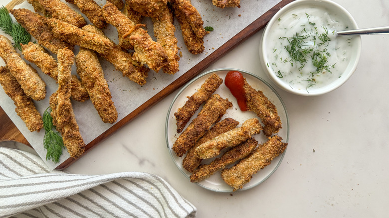 No question, fries are a staple when it comes to side dishes, and rightly so — any form of crispy and salty potato is a welcome accompaniment to sandwiches, burgers, and wraps. But the humble potato isn't the only vegetable that can be turned into a fry. Eggplant takes center stage in this recipe for air fryer fries, and it's a great way to bring in a new veggie to your side dish repertoire. The best part is, when you use the air fryer you get a crispy and delicious texture without deep frying, making these fries a lighter alternative. A coating of seasoned breadcrumbs adds an extra level of crunchiness. We're pairing them with a tangy dill dip that is speedy to make and doesn't require getting the food processor out.