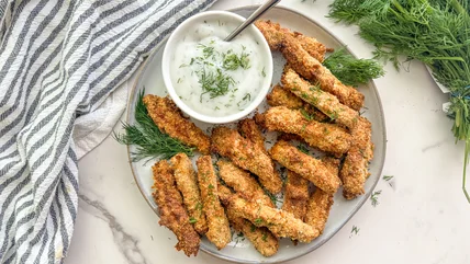 With the help of an air fryer, batons of eggplant are transformed into crispy-tender fries and served with an easy and flavorful dill dipping sauce.