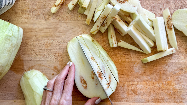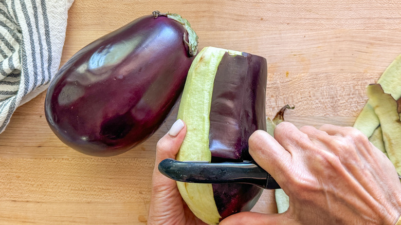 To start, there are many varieties of eggplant and any type will work. If you use Chinese or Japanese eggplant, you will need about 4 of them because they are smaller and thinner. They will take a little more time to peel and cut just based on their shape, but because they are a little drier inside, you can get away without the salting step.
