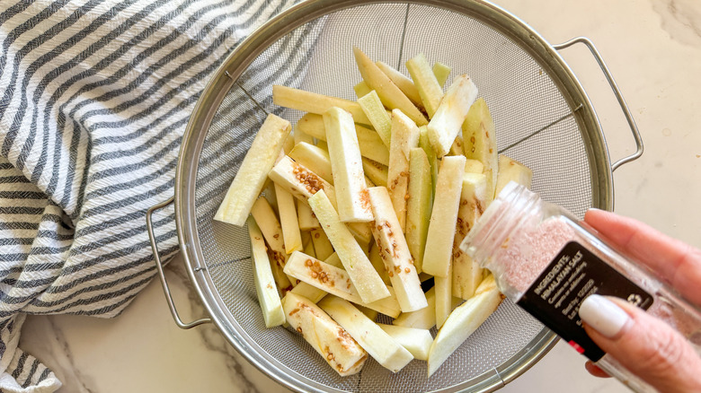 - Place the eggplant in a colander, shake on ¼ teaspoon salt, and let it sit for 20 minutes.