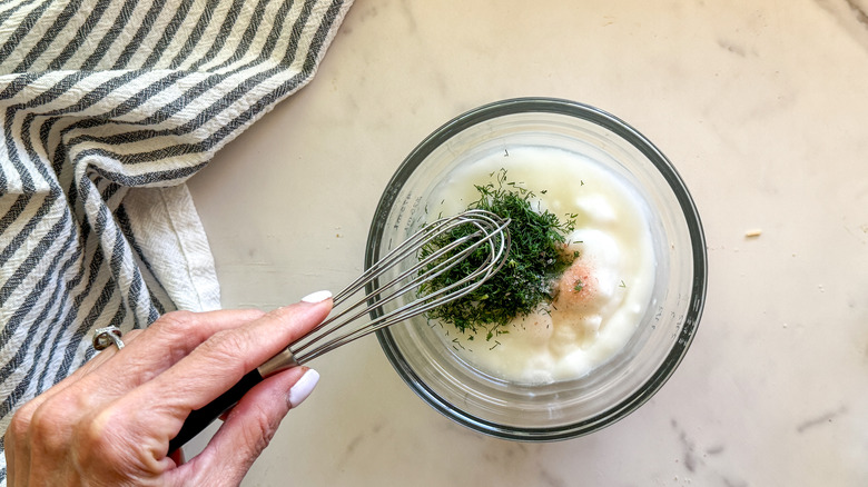 While they are cooking, combine the yogurt, dill, lemon juice, remaining garlic powder, and remaining salt.