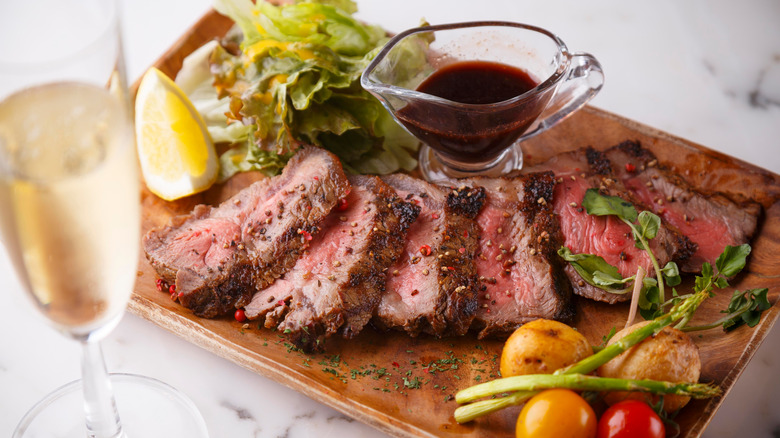 "This depends on the preparation of the steak and the sauce, but if you're keeping it simple, I would go with a Blanc de Noirs Champagne," Stephens told Tasting Table. You might not be familiar with the reasons as to why Champagne pairs so well with steak, or even that the two pair together at all. But Stephens knows wine like the back of her hand and this food pairing proves it. She explains that Blanc de Noirs "is a fuller-bodied Champagne with crisp acidity that will counterbalance the steak's fattiness."