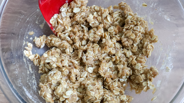 - In a large bowl mix together the flour, brown sugar, granulated sugar, oats, vanilla extract, baking powder, cinnamon, and salt.