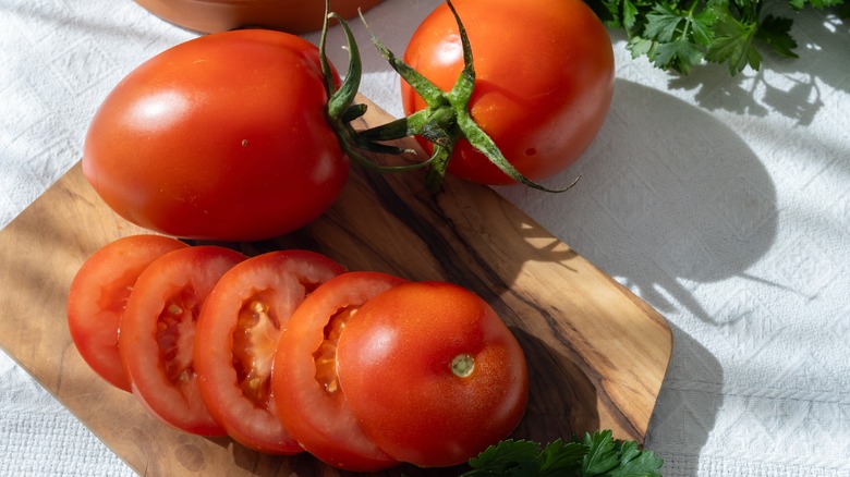 Roma tomatoes are particularly great for making homemade tomato sauce. Other common uses include dicing them for salads, adding them to stews, and roasting them for soups. They can also be used in sandwiches and wraps, although they will not hold their shape as well as round tomatoes.